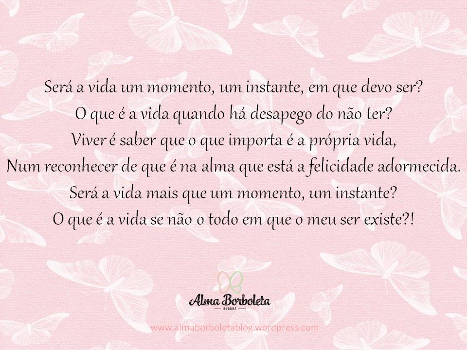 Sobre a vida 13 de August de 2020 ~ Paula de Oliveira Partilhar isto: Share on X (Opens in new window) X Share on Facebook (Opens in new window) Facebook Like Loading... Related Published by Paula de Oliveira Autora de "Alma Borboleta" View all posts by Paula de Oliveira